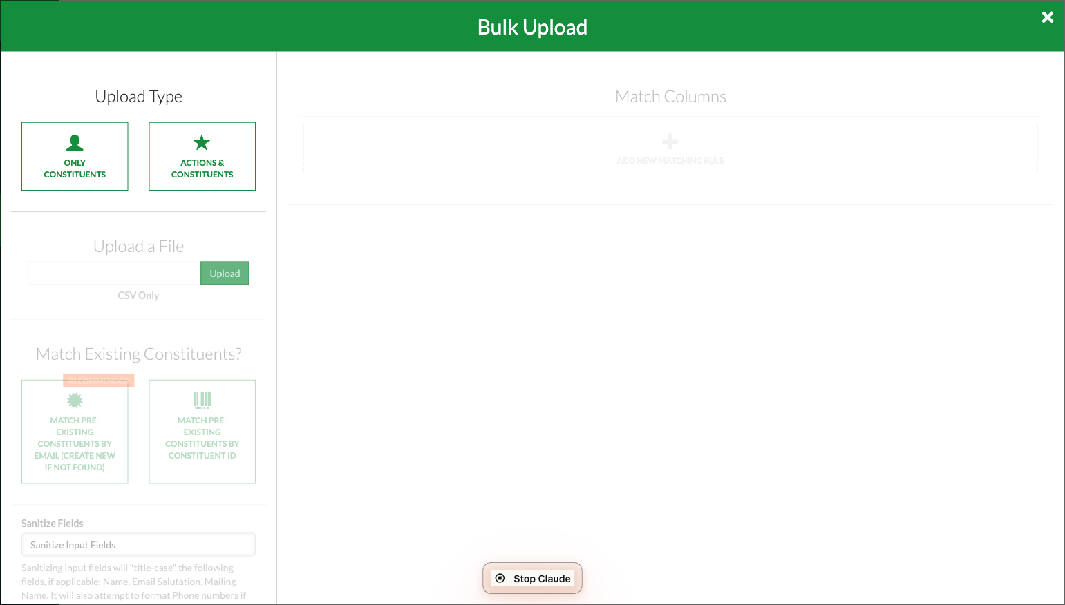 Step 3. Once satisfied with the preview, click “Finalize Upload.” The system will apply the tag to all matched constituents. You will receive a confirmation once the upload is complete.