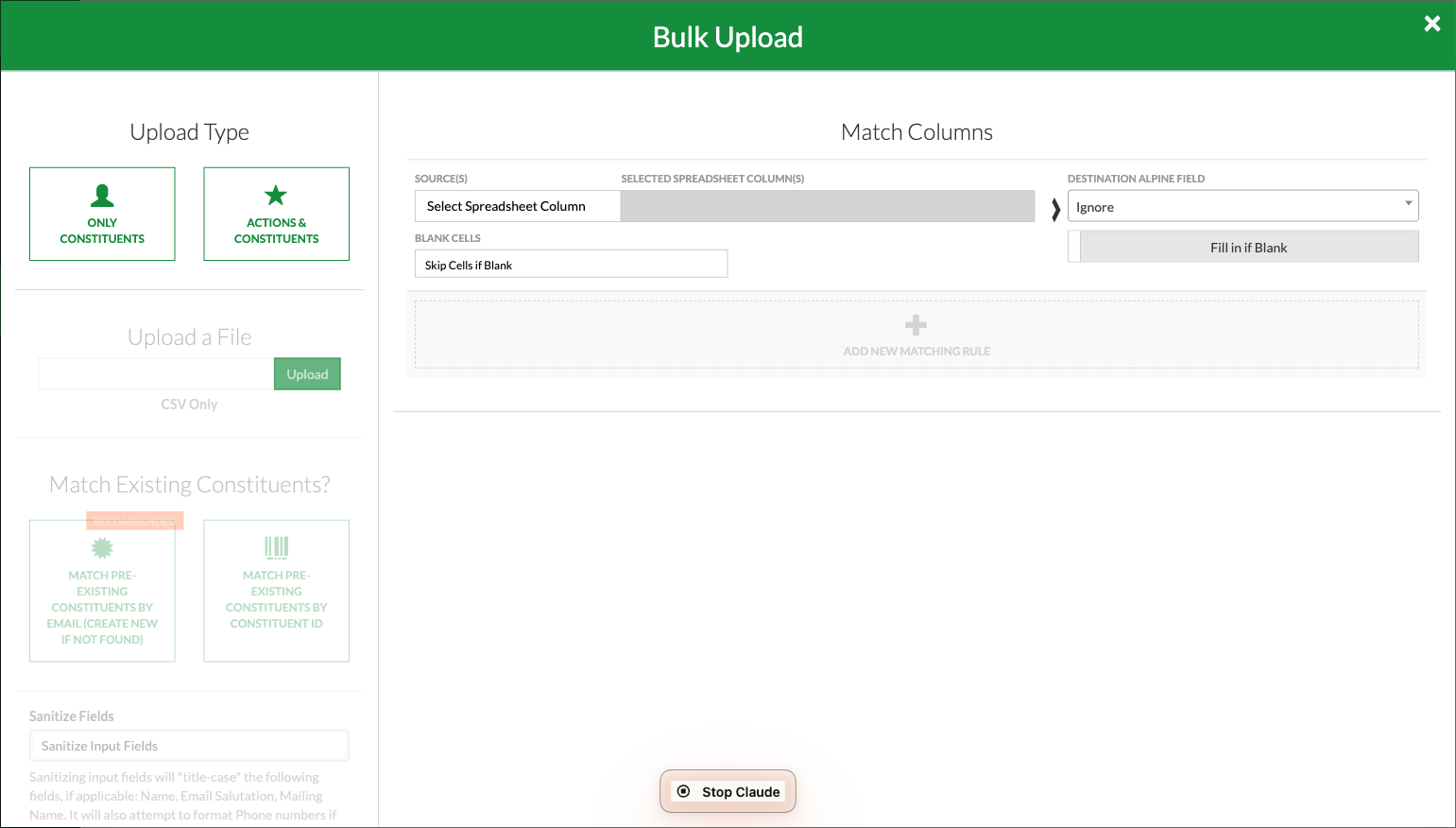 Step 4. In the “Match Columns” panel on the right, click “+ ADD NEW MATCHING RULE.” A new row will appear with dropdowns for Source, Selected Spreadsheet Column(s), and Destination Alpine Field.